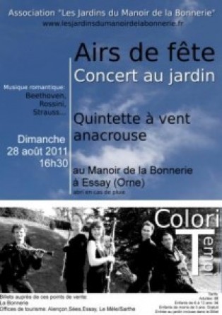 Le quintette à vent Anacrouse est en concert le dimanche 28 Août à 16h30 dans les jardins du Manoir de la Bonnerie. Reicha, Onslow, Chabrier, Beethoven, Rossini, Dvorak, Gounod, Strauss vous combleront de joie en cette fin d’été. Vous l’avez compris visite des jardins et concert sont au programme dans un cadre magnifique qui n’est qu’à 170 km de Paris. Pour information supplémentaire, le manoir est de la fin du 15ème, début du 16ème siècle. Amoureux de ces sites et de la musique, venez vous recharger avant la rentrée.