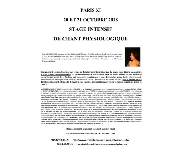 Graziella Gonzalez, membre de Colori tempi, vous propose un stage de chant physiologique le 20 et 21 octobre 2018 (cf tract ou liens web), Paris 11ème.